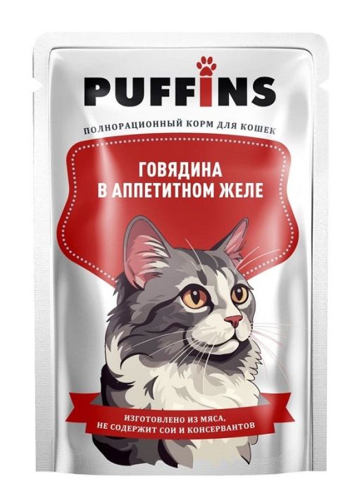 Паффинс консервы для кошек 75 гр желе Говядина