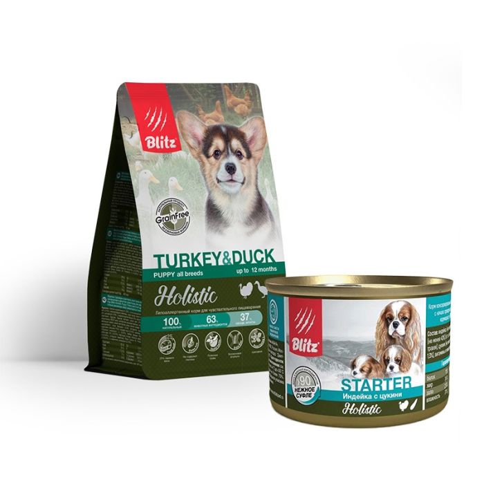 Блитц для щенков АКЦИЯ Индейка&Утка 500гр беззерновой +Starter индейка с цукини, корм консервированный полнорационный для щенков, беременных и кормящих сук, 200 г
