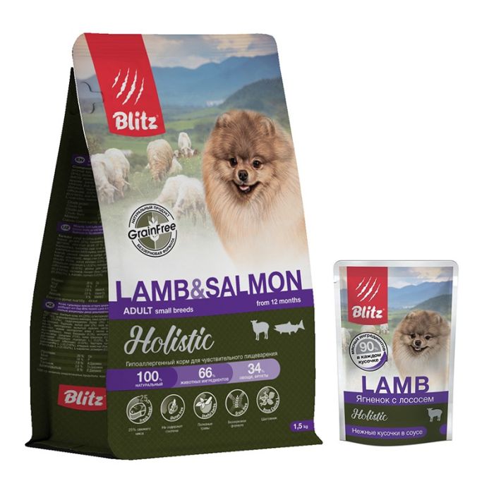 Блитц для взрослых собак мелких пород 1,5кг с ягненком и лососем Беззерновой