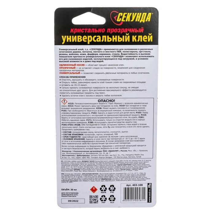 Клей Секунда универсальный кристально-прозрачный, 30 мл, 403-108