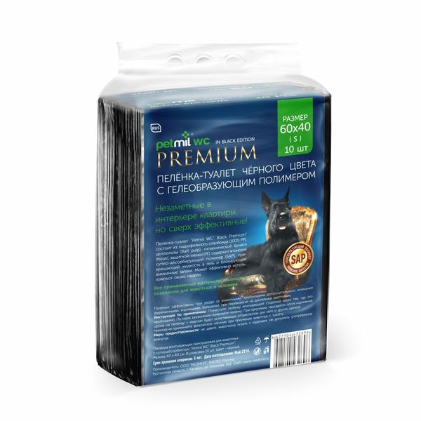 Пеленки впитывающие для животных PETMIL PREMIUM BLACK 60 * 40 сорбент 10 шт черные