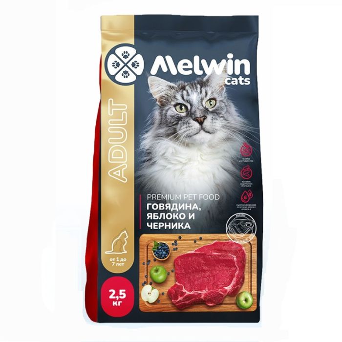 МЕЛВИН (MELWIN) для кошек от 1 до 7 лет с говядиной, яблоком и черникой 2,5 кг