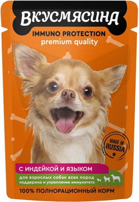 ВКУСМЯСИНА консервы для собак Индейка и язык кусочки в соусе для собак с чуствительн 85гр пауч