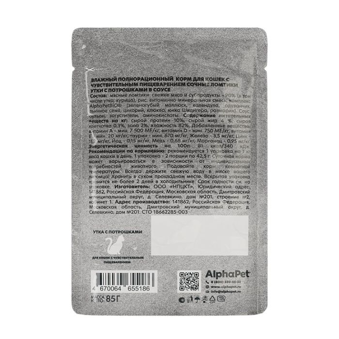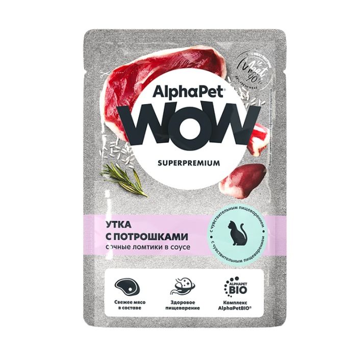 AlphaPet WOW Superpremium консервы для кошек с чувствительным пищеварением 85 гр утка и потрошки в соусе
