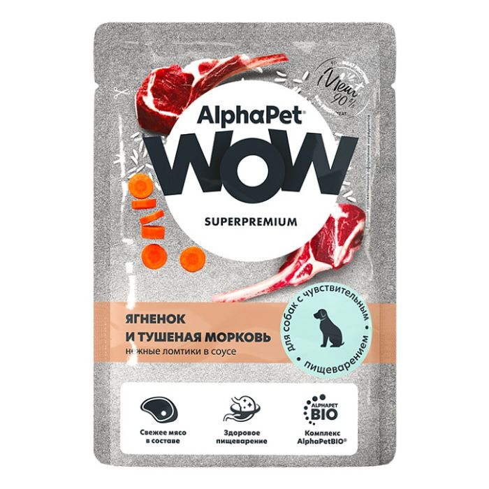 AlphaPet WOW Superpremium консервы для собак 85 гр чувствительное пищевариение ягненок и тушенная морковь нежные ломтики