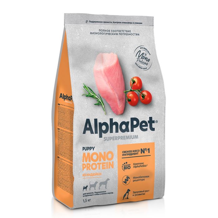 AlphaPet Superpremium для щенков, беременных и кормящих собак мелких пород 1,5кг индейка MONOPROTEIN
